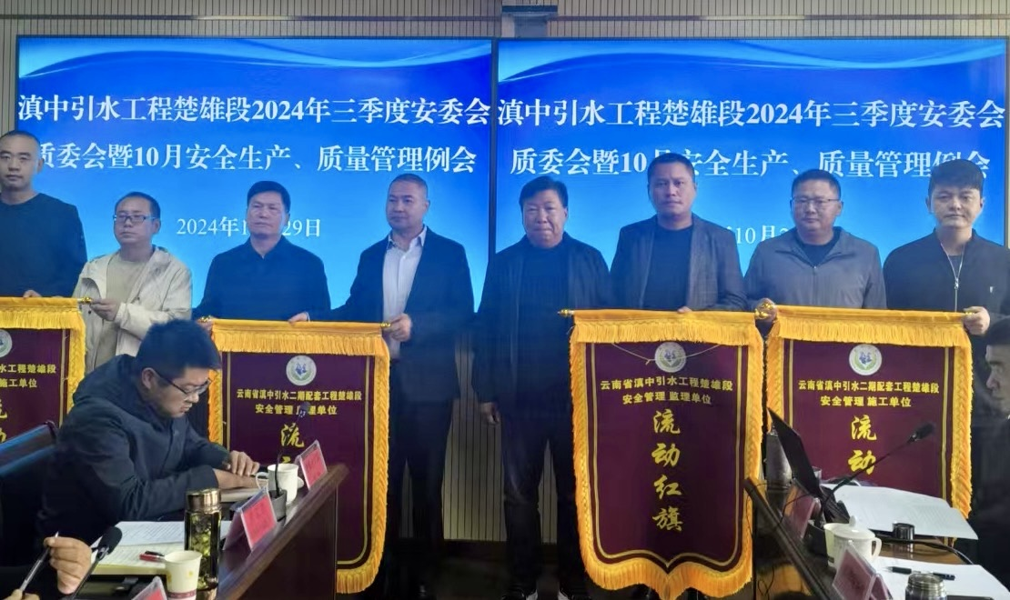 2024年10月29日上午,云南省滇中引水工程建设管理局楚雄分局召开2024年三季度“安全生产、质量管理”例会。分局领导为获奖单位颁发流动红旗奖。